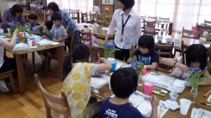 今日の放課後まなび教室は,絵手紙の活動をしました。今日はガクアジサイをモチーフに,地域の絵手紙の先生に教えていただきました。6月らしいすてきな絵手紙ができました。