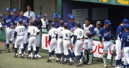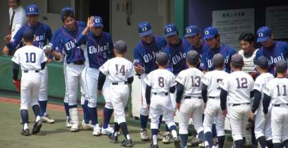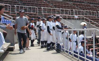 全員が,スタジアムのグラウンドの感触を確かめながら,退場していきます。この後,大学生の試合観戦をしました。