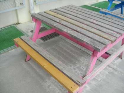 運動場に設置している木製ベンチの一部が欠けてしまいましたので,すぐに管理用務員が修理をしました。