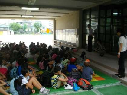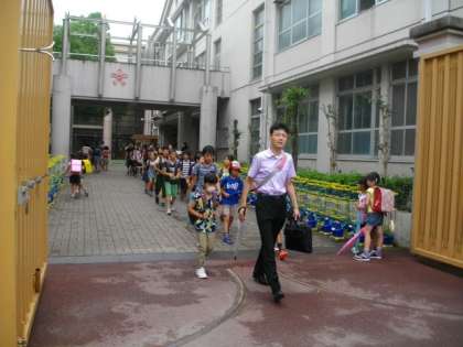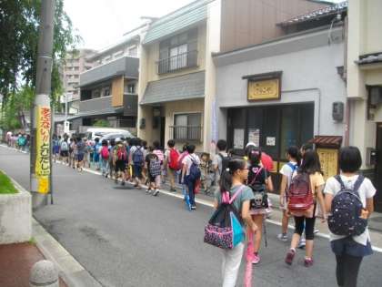 今日は,5年生が生き方探究館で学習します。8時に集合して,先生のお話を聞き,出発しました。