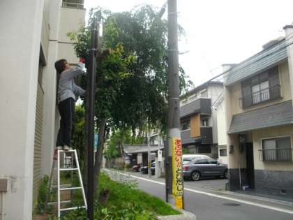 雨があがりました。管理用務員が,校門前の剪定を行っています。生い茂っていた葉を刈り,すっきりとしました。