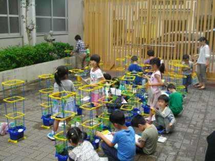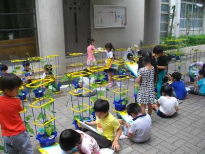 1年生が朝顔の観察をしています。つるがぐんぐん伸び,大きな葉が育ってきた様子を丁寧に記録していました。