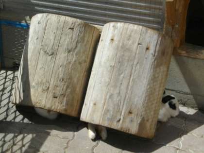 答え:小屋の前の日陰に隠れています。最近,暑さのせいか,小屋からでてきますが,日陰で寝そべっていることが多いようです。かわいいしっぽだけがみえています。