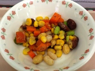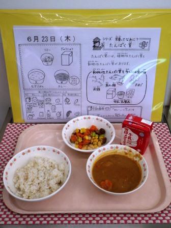 カレーに入っている脱脂粉乳・チーズ・ヨーグルトは,牛乳から作られる乳製品です。乳製品は,動物性たんぱく質を多くふくむ食べ物の一つです。ハートの形の「ハッピーキャロット」を見つけて,喜んでいました。ソテーにはミックスビーンズも入れました。