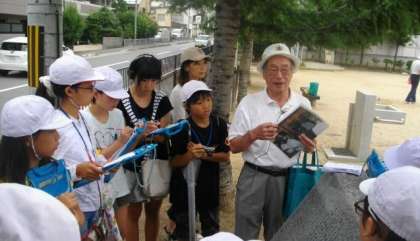 6年生が,総合的な学習の時間で,地域の歴史について調べています。今日は「西陣空襲」について調べているグループが,地域の方にお話を聞かせていただきました。辰己公園にある「空襲被災を記録する碑」を訪れたり,昌福寺に訪れたりする中で,当時の様子を教えてもらうことができました。また,ご自宅に保存されている爆弾の破片を見せていただくこともでき,子どもたちは写真を撮りながら熱心にメモを取っていました。