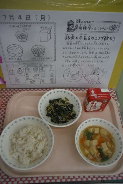 「わたしは,こうやどうふのそぼろにとむぎごはんが合ってとてもおいしかったです。いつもおいしい給食ありがとうございます。ほうれんそうともやしのごまにも野菜のうまみがでていておいしかったです。」(4年児童)