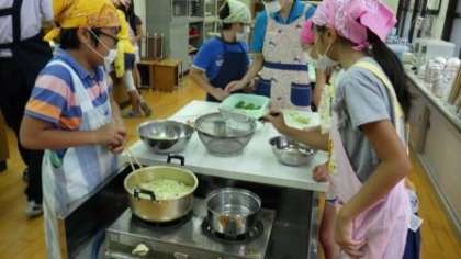 5年生が調理実習でゆでたまごとゆで野菜のサラダを作っています。サラダにかけるフレンチソースも手作りです。みんなで野菜や卵をゆでたり,ソースの分量を量ったりしながら作っています。