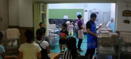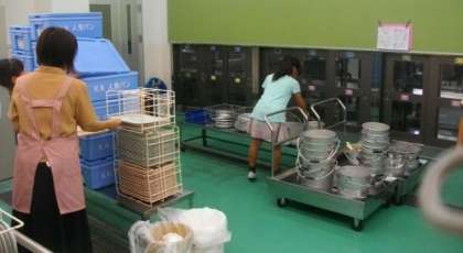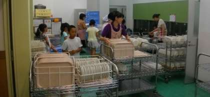 楽しい給食が終わりました。サービスホールに食器を返却しています。元気のよい「ごちそうさまでした」の声が響いています。