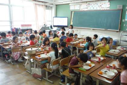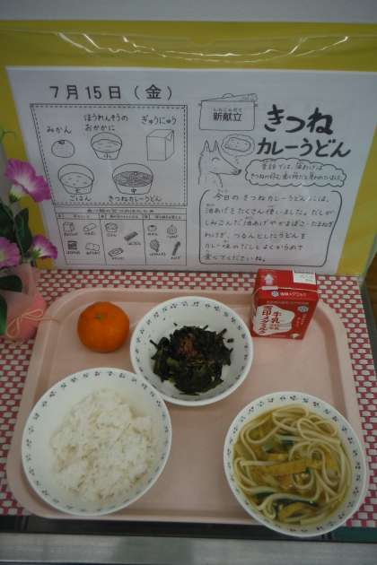 「私は,きつねカレーうどんがおいしかったです。めんがもちもちしていたからです。デザートのみかんもとてもおいしかったです。いつもおいしいごはんを作ってくれてありがとうございます。」(4年児童)