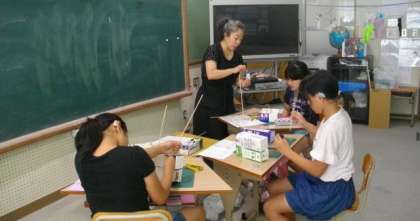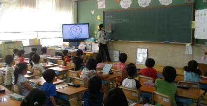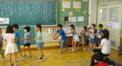 1年生は,国語「おおきなかぶ」の学習をしています。「うんとこしょ,どっこいしょ」と,みんなで力を合わせてかぶを抜くシーンを演じて,登場人物の気持ちをかんがえています。