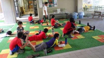 今日はタッチフットボール部が練習をしています。放課後も気温が高いので,日陰やピロティを使って,ストレッチをしたりダッシュの練習をしたりしています。