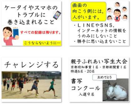 うれしいことに,5月に動物園で行われた「親子ふれあい写生大会」の作品で京都府知事賞1点,京都新聞賞1点,特選6点,入選が20点も選ばれて,表彰されることになりました。また,書写作品コンクールでは9人の作品が入選し,表彰されることになりました。このほか,スポーツの分野でもたくさんのお友達が活躍しています。よく頑張りましたね。お祝いの拍手をしましょう。
