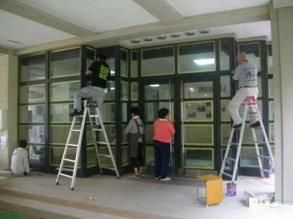 管理用務員さんによる共同作業でお世話になっています。高いところも,マスキングテープをはっていただきました。