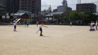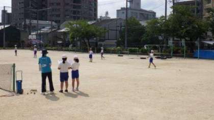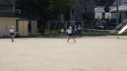 テニス部が夏休みの練習をしています。ルールを確かめながらゲーム形式の練習をしています。