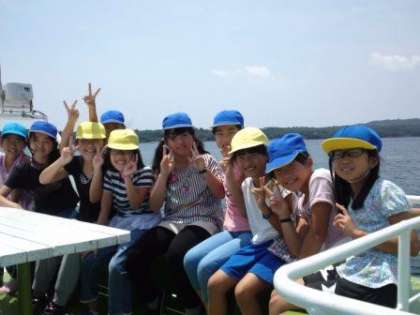 予定通り,賢島港にバスで到着しました。次は船に乗って,みさきの家にある「なかよし港」へ向かっています。とてもいい天気で,船からたくさんの島々が見えます。