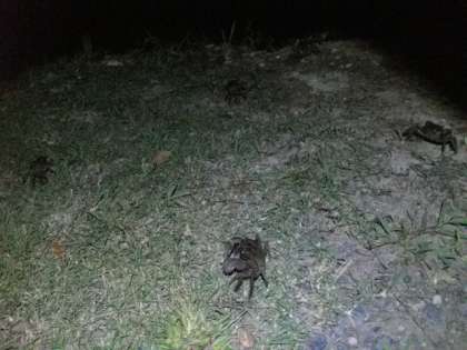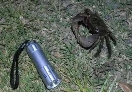 ナイトハイクをしていると、たくさんの虫の音やカエルの鳴き声、風の音などが聞こえてきます。ふと道の端をみると、たくさんのカニが、静かに移動していました。