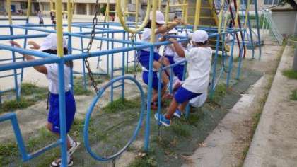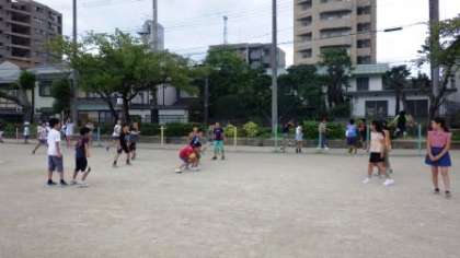 風があり,涼しい天気になりました。ドッヂボールやバスケットボール,総合遊具などでたくさんの子どもたちが遊んでいます。