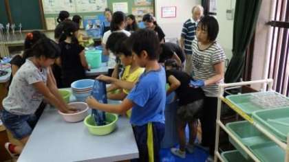 図画工作の学習で藍染めに挑戦しました。きれいな模様ができて,とても嬉しそうでした。