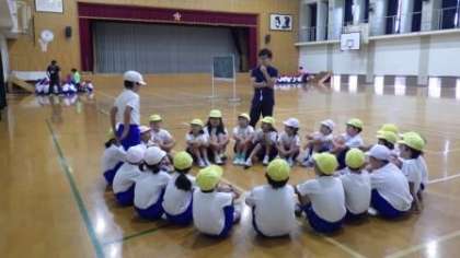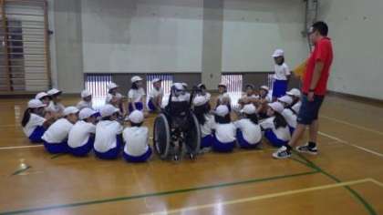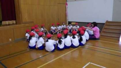 雨で運動場が使えないので,体育館で運動会練習をしました。大玉送りの入場や掛け声などについて各色で話し合いをしました。