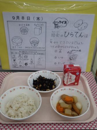 今日は人気献立の「平天とこんにゃくの煮つけ」についてのクイズを出しました。