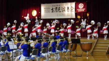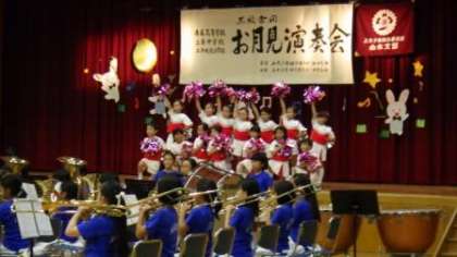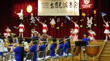 お月見演奏会に出演させていただきました。金管マーチングバンドの演奏に合わせて,フラッグなどを使って発表しました。