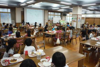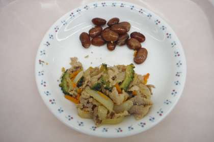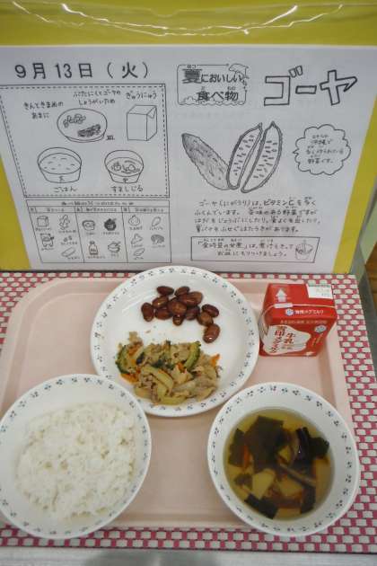 「ぶたにくとゴーやのしょうがいためがとてもごはんとあっていておいしいかったです。とてもおいしかったので,いつかぶたにくとゴーヤのしょうがいためをいっぱいふやしてくれたらとてもうれしいです。」(2年児童)