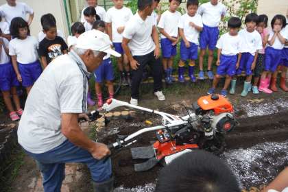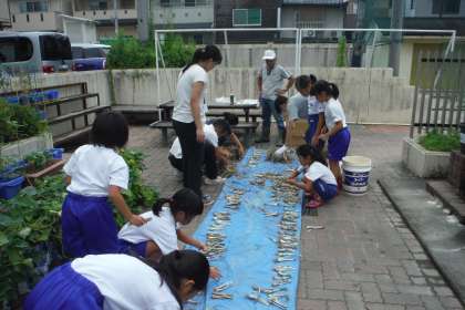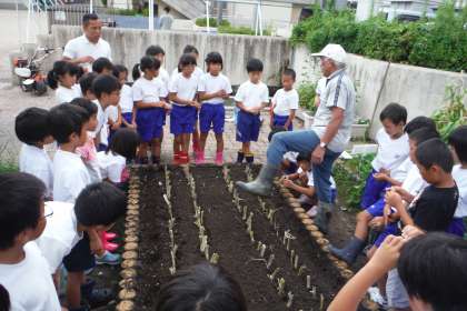 13日(火)の3・4校時に3年生が学校園で,九条ネギの苗植えを行いました。