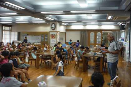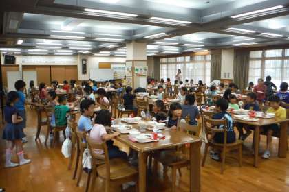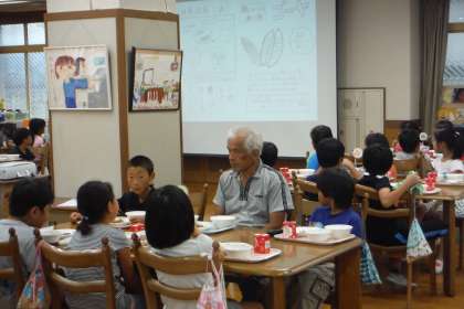 3年生が,九条ネギづくりの名人と給食をランチルームで食べました。