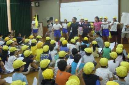 今日の運動会フリータイムは雨が降ったので,白組・黄組それぞれが特別教室で応援の練習をしました。