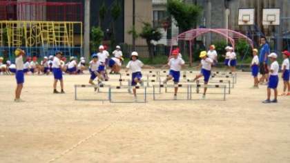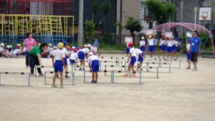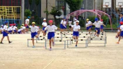 運動会の個人種目「50mハードル走」の練習をしています。自分に合ったインターバルに合わせてハードルを設置しています。