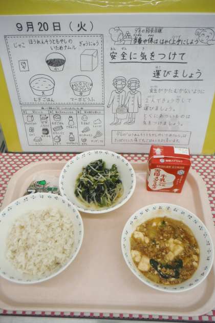 「ほうれんそうともやしのいためナムルがシャキシャキしておいしかったです。マーボどうふが少しピリッとしたけれど,よいくらいのからさでおいしかったです。」(4年児童)