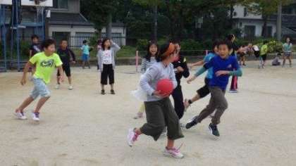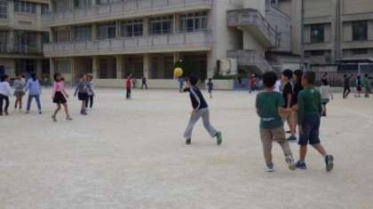 高学年の子どもたちがたくさん外に出て遊んでいます。ドッジボールやバスケットボールをしている学級が多いです。