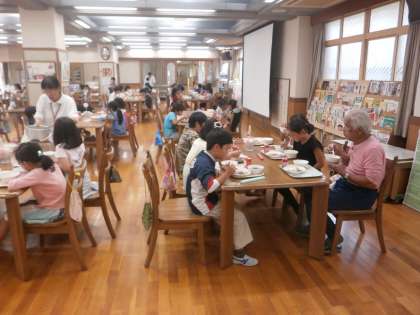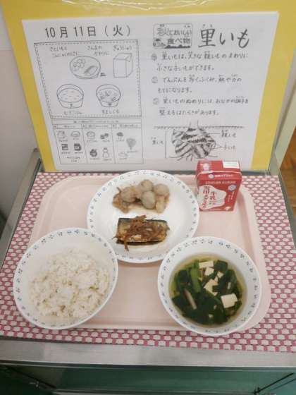 「さといもとこんにゃくのとさにがとてもおいしかったです。さんまのかわりにが,むぎごはんとあっていました。すましじるもおいしかったです。」(2年児童)