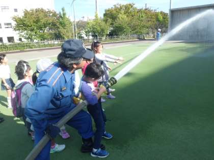今年は,南区にある消防活動総合センターへ見学に行きました。参加した児童や保護者の皆さんは,起震車体験や,放水体験,煙体験など,地震や火災の疑似体験をしました。