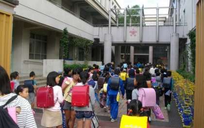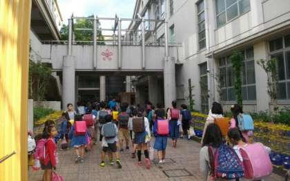 曇り空ですが,少しずつよい天気に向かうようです。子どもたちが元気に登校してきました。