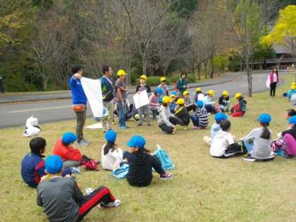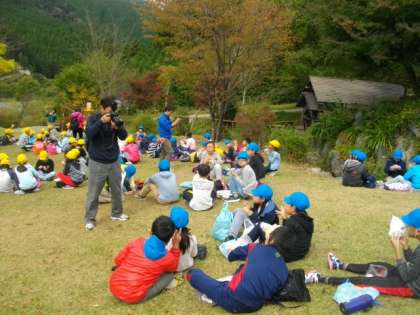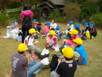 お家で用意していただいた昼食を,水車小屋近くの芝生でおいしくいただいています。