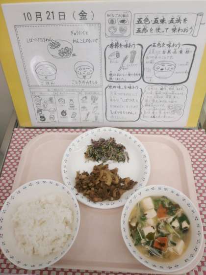 和食が「五」という数を大切にしていることを伝えるために考えた献立です。五色のみそ汁には,赤(にんじん)緑(ねぎ)黄(えのきだけ)白(とうふ)黒(わかめ)の五つの色の実を入れました。
