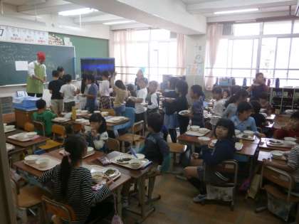 3年生の教室では,しば漬けちりめんのおかわりに大行列ができていました。