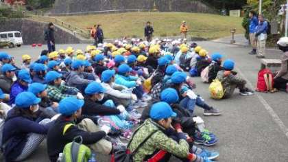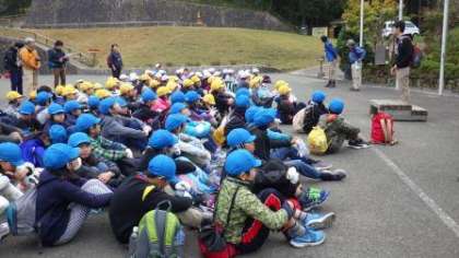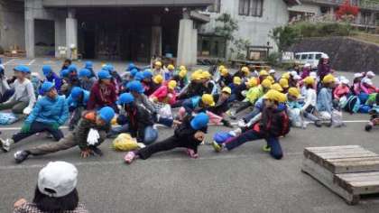 今日は正親小学校と一緒に天狗杉コースの登山へ行きます。山の家の先生のお話を聞いた後,準備運動をして出発します。