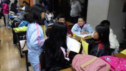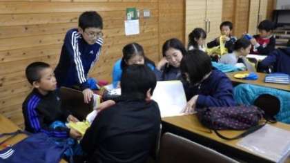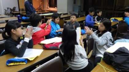 研修室で班ごとに振り返りをしました。友達の感想に自然と拍手している姿がすてきでした。明日もいろいろな活動を楽しみたいと思います。