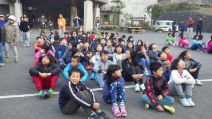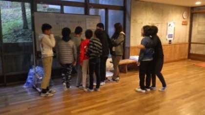 ホワイトボードの連絡をしっかりと読んで,集合時刻や持ち物を確認しています。気温としては冷え込んでいないようですが,風が強いので寒く感じます。朝の集いを待つ間,雲がとても速く動いているのに気付いて,みんな空を見上げていました。