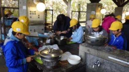 山の家で2回目の野外炊事を行います。今日の献立は,班ごとにいろいろな料理をつくる「野外炊事バイキング」です。