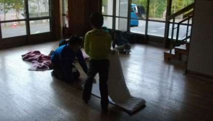 6時に起床です。今日はシーツの返却をするので、協力してたたんでいます。