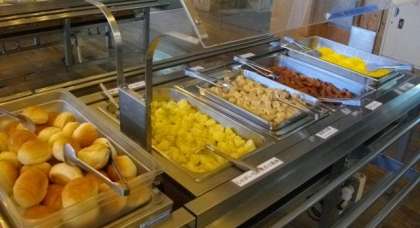 朝食の様子です。卵焼き、ウィンナー、高野豆腐、サラダ、ポテトなど、みんなもりもり食べています。