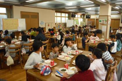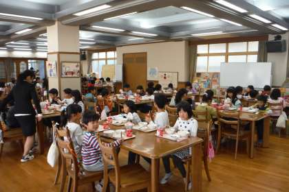 今週は,2−3と4−2のなかよし給食を行います。ランチルームで自己紹介をしたり,すきな給食の話をしました。