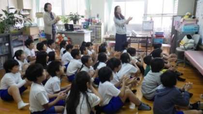 今日は4年生が体重測定をしています。測定の前に,手の洗い方についての話も聞きました。