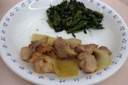 しょうゆやみりんで味付けした鶏肉と玉ねぎをスチームコンベクションオーブンで焼きました。鶏肉がやわらかく,たまねぎが甘く仕上がりました。赤だしには,湯葉を使いました。
