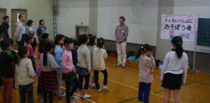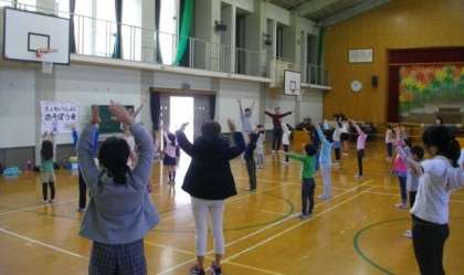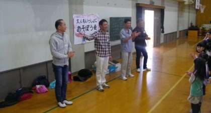 学校運営協議会 チャレンジ部会の皆さんが,「大人もいっしょにあそぼう会」を企画してくださいました。おやじの会が中心になって,大人も子どもも楽しいひと時を過ごすことができました。最初は,ラジオ体操で体をほぐしました。