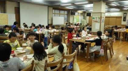 今週は2年1組と4年3組が「なかよし給食」です。ランチルームで一緒に給食を食べます。今日は自己紹介や好きなものなどを話しながら,楽しく給食を食べました。