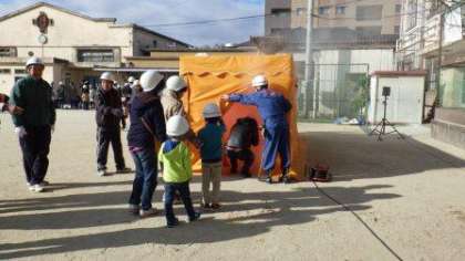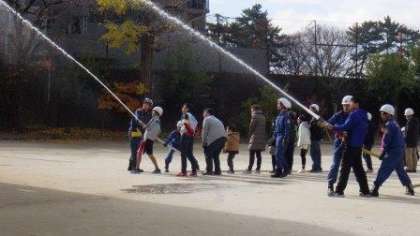 地域の総合防災訓練が元待賢小学校で行われました。各町内から元待賢小学校へ避難訓練をした後は,煙体験や消火体験などがあり,たくさんの子どもたちも参加していました。